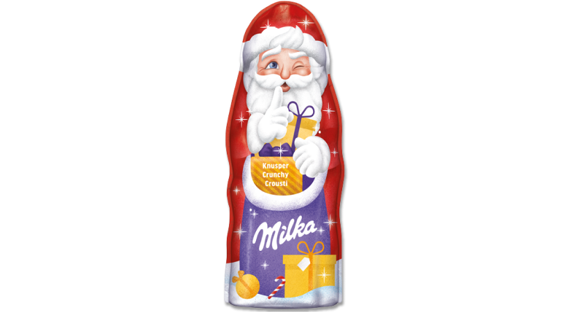 Der Milka Weihnachtsmann Knusper 45g besteht aus zarter Milka Alpenmilch Schokolade mit kleinen Knusperstückchen. Der große Genuss für alle, die es knusprig lieben.