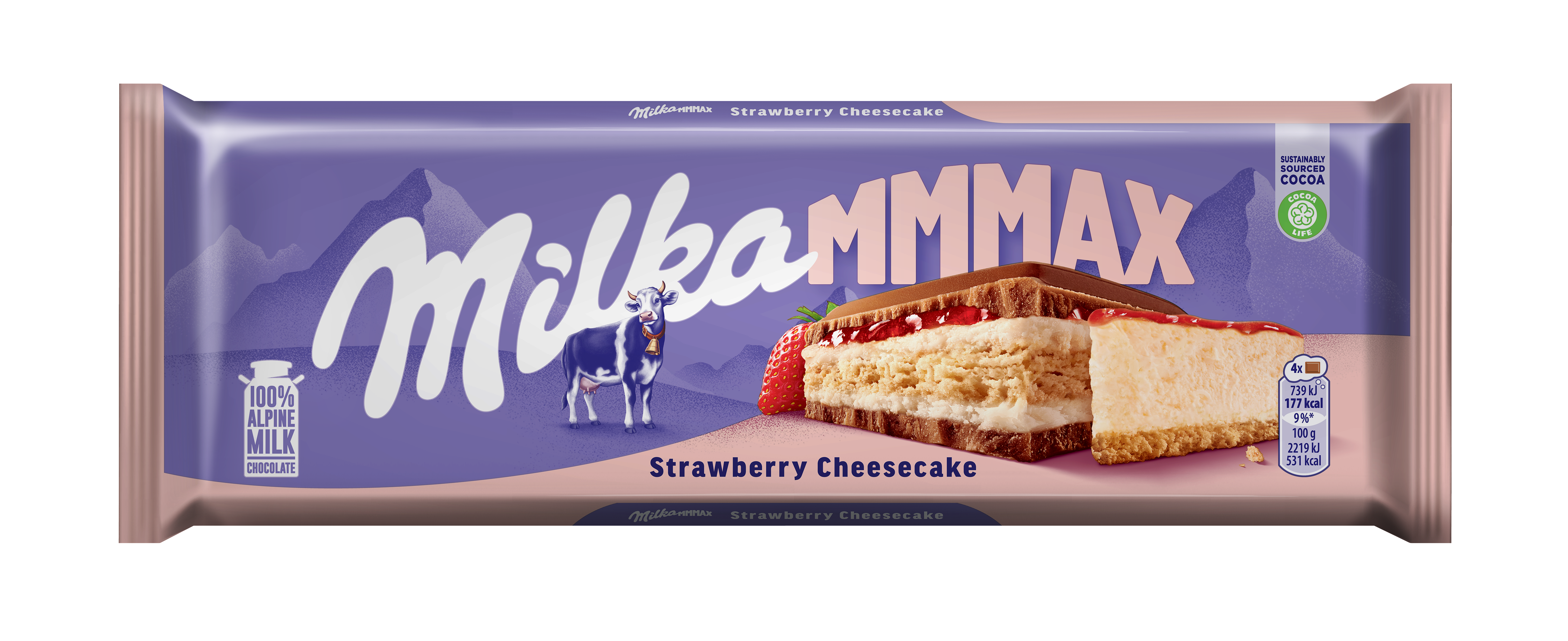 Milka Mmmax Strawberry Cheesecake je čokoladna poslastica koja se topi u ustima napravljena od Milka Alpine Milk s voćnim punjenjem i hrskavim keksom.