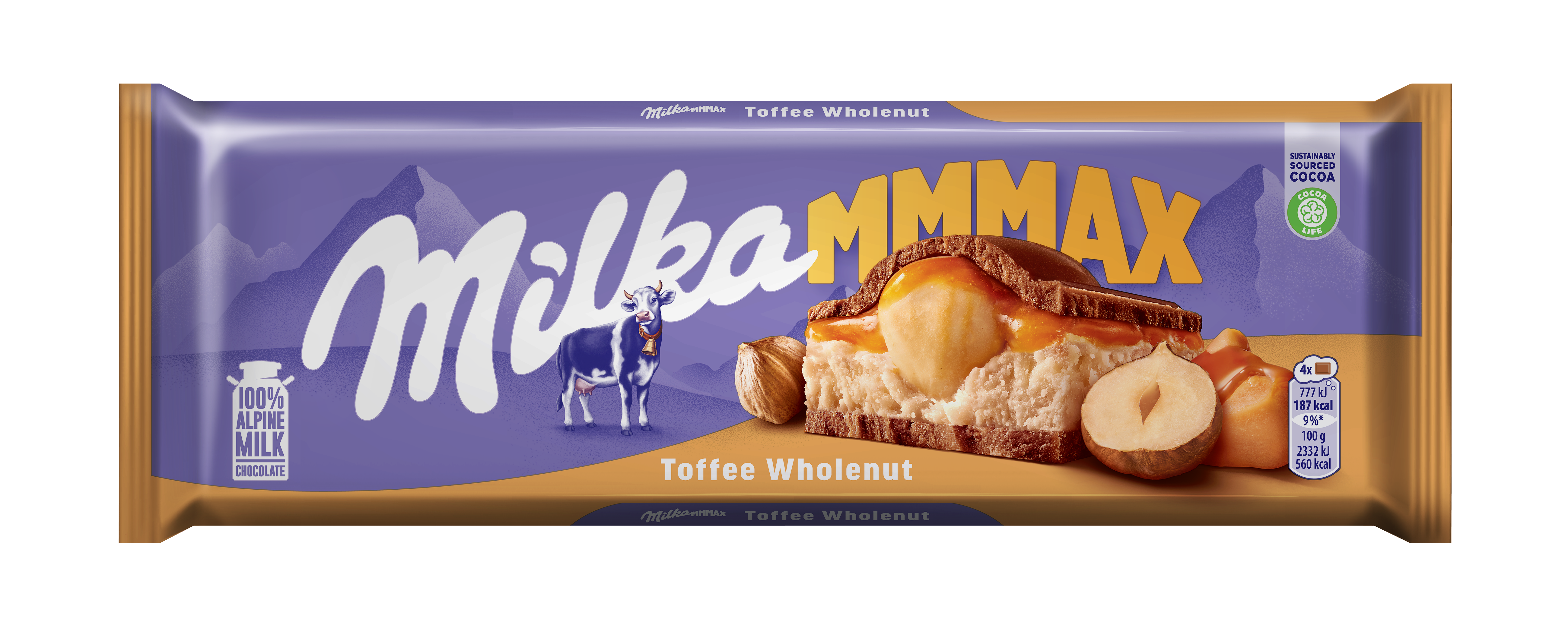 Milka Mmmax Toffee Whole Nut – ovo je čokoladna poslastica koja se topi u ustima napravljena od Alpine Milk čokolade sa 100% alpskim mlijekom. Kremasta karamela i cijeli lješnjaci upotpunjuju kompoziciju.