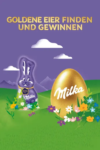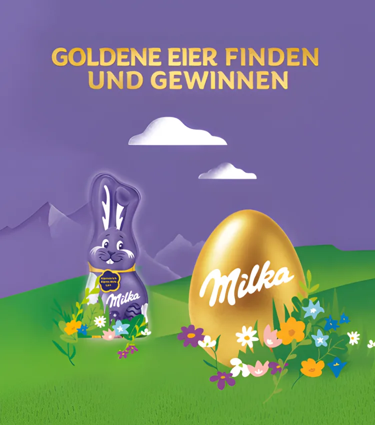 Starte schon jetzt in den Frühling, finde die goldenen Milka Eier und gewinne bis zu 25.000 €.