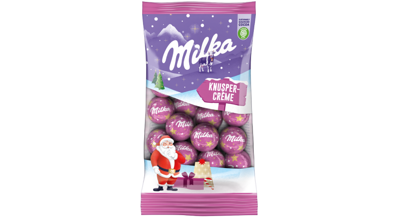 Knusper, knusper... Crème! Die Milka Weihanchts-Kugeln Knusper-Crème sorgen durch das Knistergefühl im Mund für Spaß bei groß und klein.