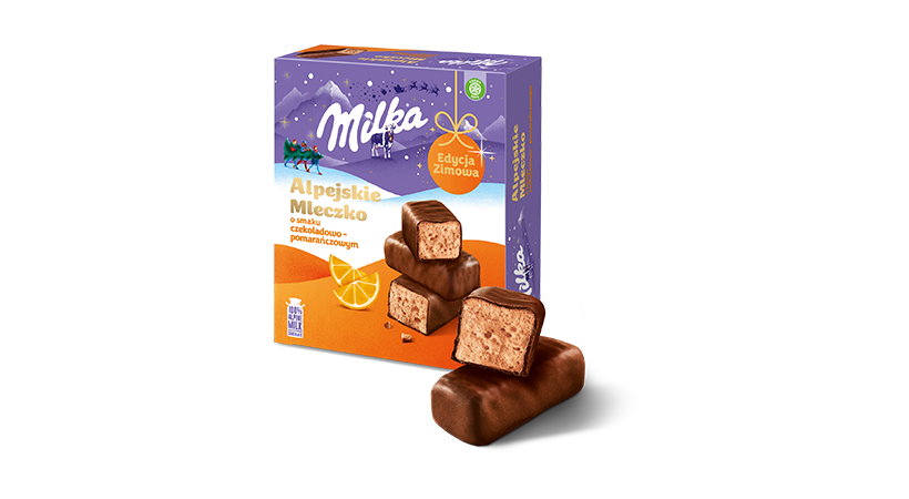 Wielbicielom klasyki polecamy Alpejskie Mleczko, w którym delikatna pianka o smaku czekoladowo-pomarańczowym skrywa się pod delikatną czekoladą mleczną z alpejskiego mleka.