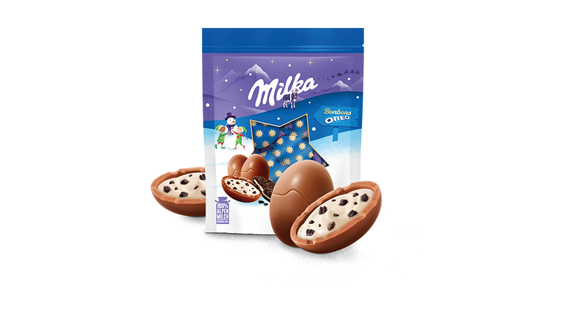 Mika Bonbons Oreo 86g to czekolada mleczna z mleka alpejskiego z mlecznym nadzieniem i pokruszone ciastka kakaowe.